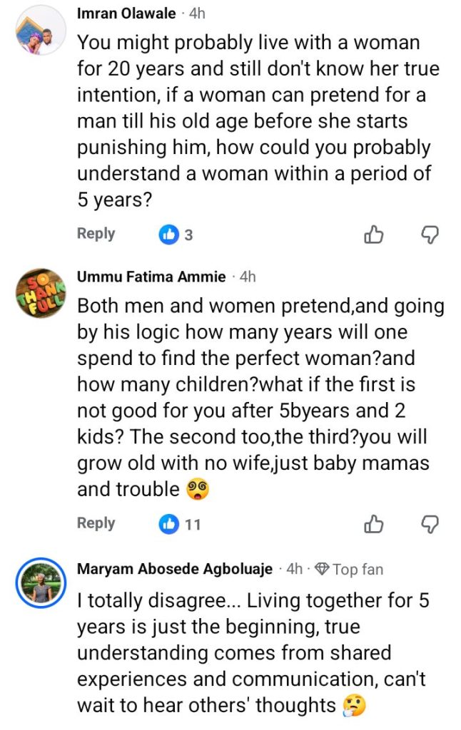 According to Ayo, a man should live with his intended bride for at least five years and if she proves herself to be peaceful, supportive, faithful, and has given him one or two kids, only then can he go ahead and marry her legally.