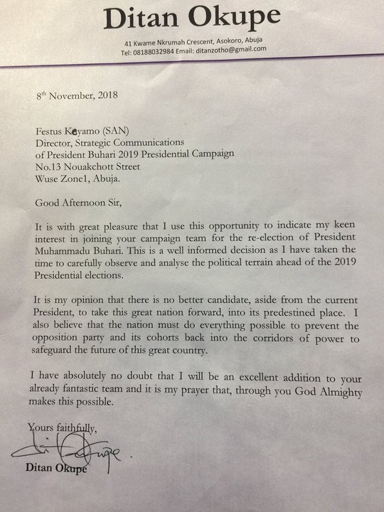 The first son of former special adviser to former President Jonathan Ditan Okupe just indicated interest in joining President Buhari’s Campaign Team.