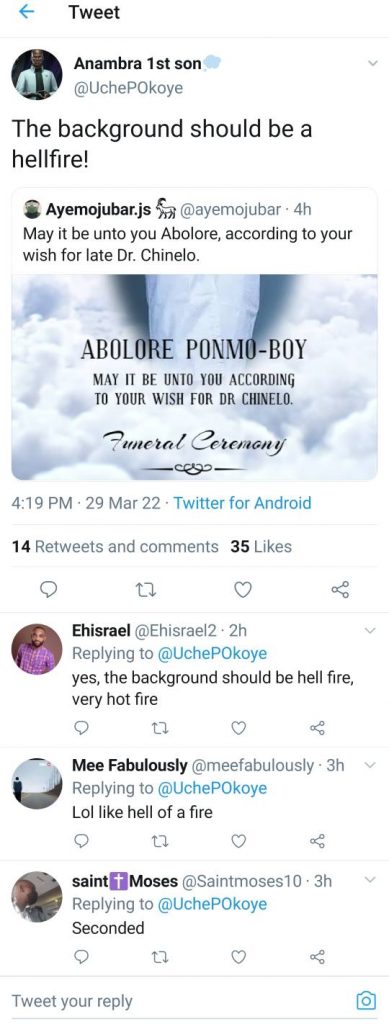 Mr Abolore, who mistook her tweet for clout chasing, sarcastically asked ‘are you dead now?’.. It sounded funny at the time as other ‘thomases’ made fun of it.