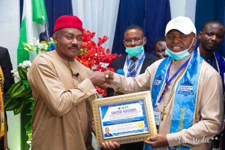Dr. Godwin Maduka, the Umuchukwu-born Harvard trained Medical doctor, triple professor of science and also Accord Party candidate in the forthcoming November 6, 2021 Anambra guber polls together with his running mate, Chief Sir Ken Ifeatu Obi were conferred with the Distinguished Ambassadors for World Peace by the United Nations Organization during the event.