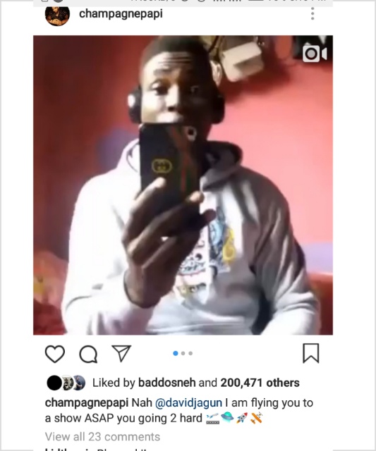 He always do a couple of Drake’s songs and tag him with caption ‘all I need is to fly by your side on the plane’