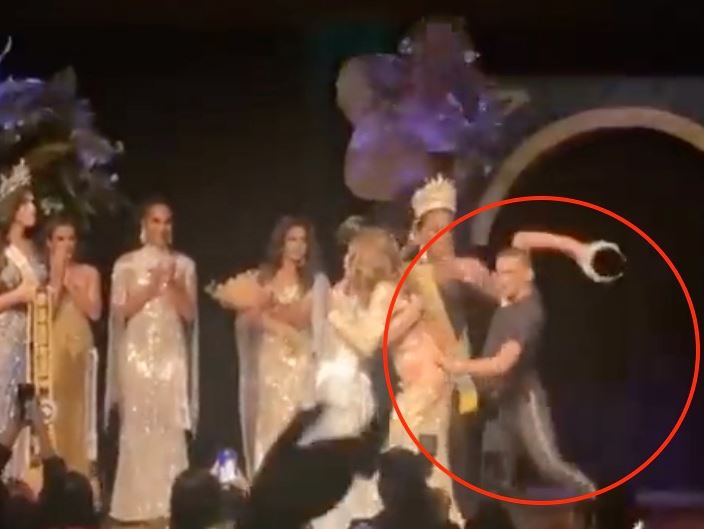 While Emannuelly Belini representing Várzea Grande was being crowned at Brazil’s Miss Gay Mato Grosso 2023 on Saturday, May 27, the husband of 2nd place-winner Nathally Becker rushed on stage and took the crown from her which he smashed on the floor.