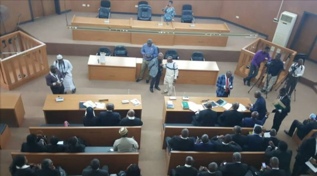 Aliyu Umar, lead counsel of federal government in the trial of Walter Onnoghen, suspended chief justice of Nigeria (CJN), argued with Zainab Duke, a lawyer on his team, in the full glare of the tribunal.