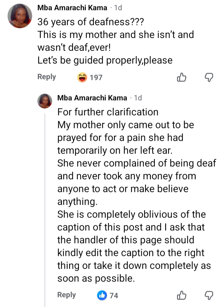 A Nigerian woman, Mbah Amarachi Kama, has sparked widespread reactions on Facebook after openly denying a pastor’s claim that he miraculously healed her mother of a 36-year hearing impairment.