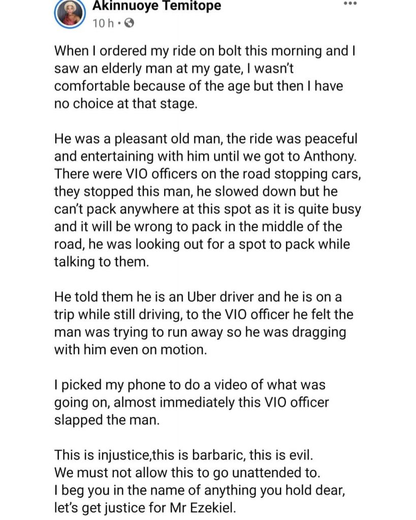 Temitope shared a video showing the officer slap the driver. She also shared a video where she was confronting the officer for slapping her driver.
