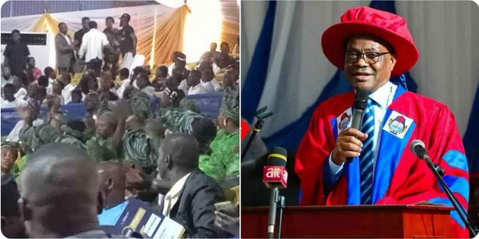 Their demonstration briefly interrupted Wike’s lecture and caused a stir before security personnel swiftly escorted them out.