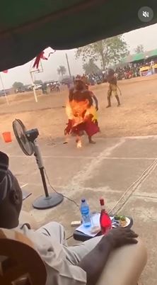 In the video shared online, the man who couldn’t put off the fire when it caught his clothes immediately took off in the direction of the onlookers who immediately dispersed, scared that they would be affected.