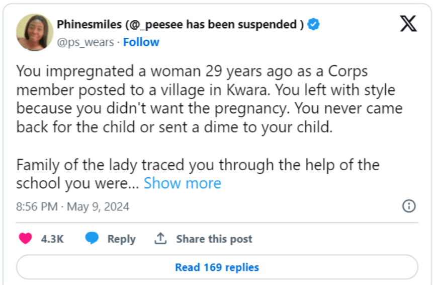 “You impregnated a woman 29 years ago as a Corps member posted to a village in Kwara. You left with style because you didn’t want the pregnancy. You never came back for the child or sent a dime to your child. Family of the lady traced you through the help of the school you were posted and traced your family residence, just to tell them you have a child after she delivered and that they want you to keep contacts for future reasons.