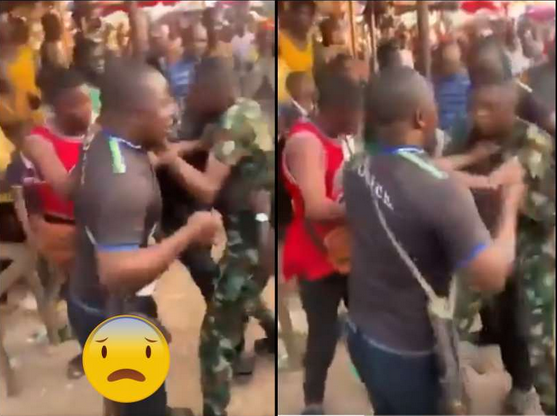 In the video, a soldier and a policeman were seen locked in an intense clash, with each holding each other by their shirt collars.