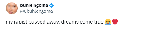 “My r3pist passed away. Dreams come true,” she wrote.