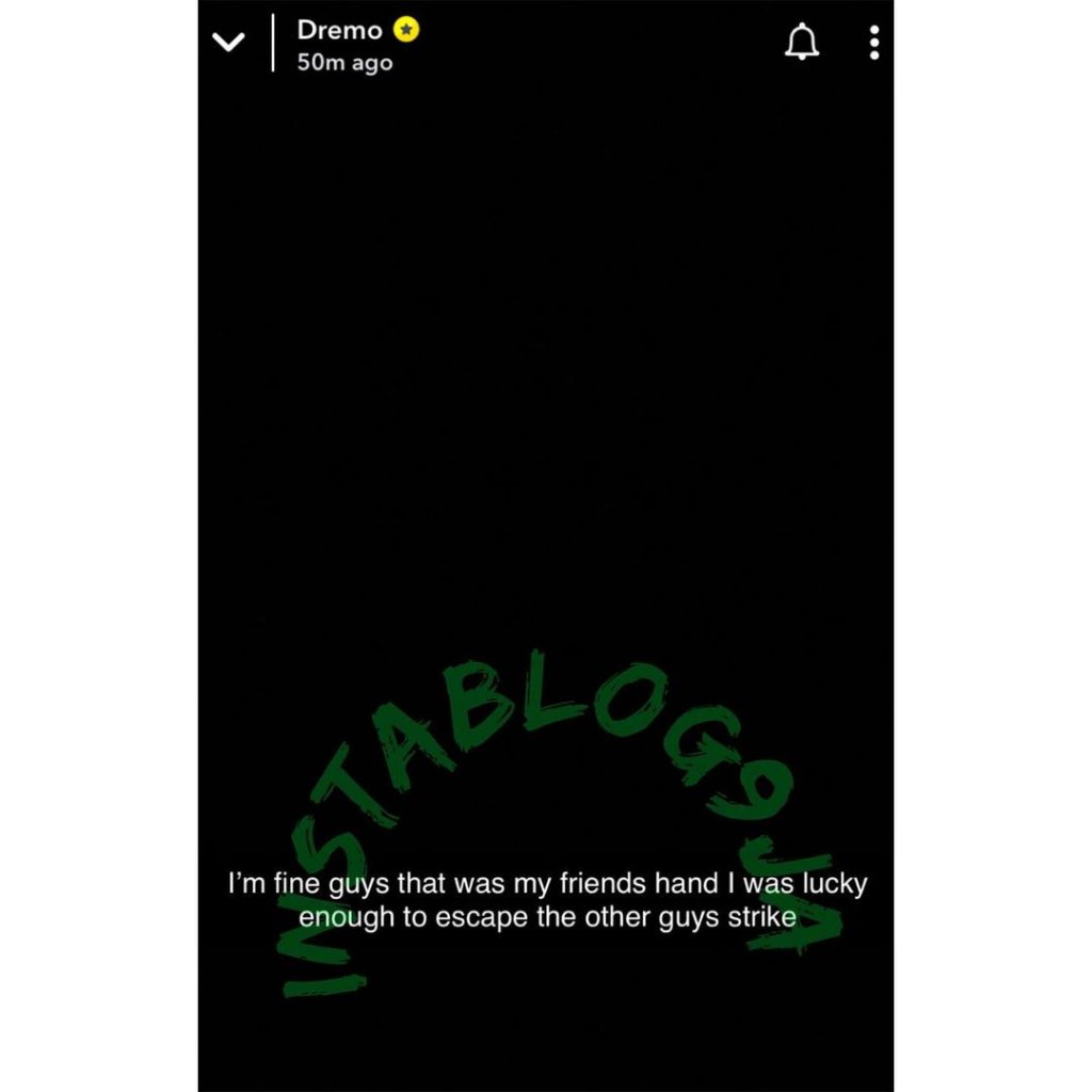 Dremo who stated that he was lucky to have survived the attack shared a photo and video of the Injured hand of his friend on his Instastories while advising other Nigerians to be security conscious;