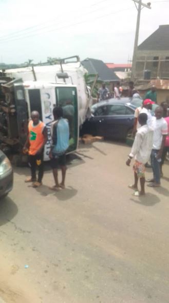 A driver was left unconscious after his truck fell on a Toyota Camry car around the Cele-Egbe Bridge, inward Ikotun, Lagos State, on Sunday, April 30.