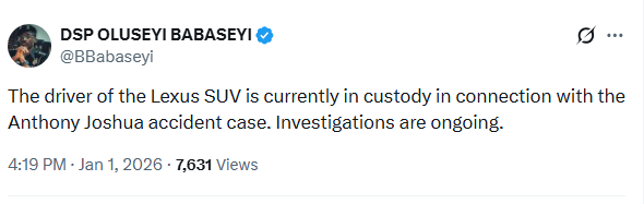 “The driver of the Lexus SUV is currently in custody in connection with the Anthony Joshua accident case. Investigations are ongoing.”Babaseyi tweeted