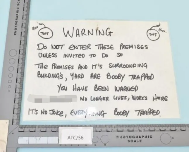 Police discovered a fishing wire stretched across a room at knee height, connected to an electrical device and battery pack. Claughton claimed the explosives were agricultural crow-scarers placed inside plastic piping and, in one instance, concealed within a bag of paint.