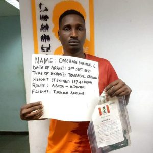 Attempts by a female passenger, Isesele Obehi and one Emmanuel Chibuzor Omebere to export illicit drugs to Europe through the Murtala Mohammed International Airport, MMIA, Lagos and Nnamdi Azikiwe International Airport, Abuja were thwarted by narcotic officers who arrested them shortly before they boarded their flights. While Isesele was nabbed on Saturday 11th September, 2021 during outward clearance of Ethiopian Airline flight at Gate B departure hall of the Lagos airport on her way to Milan, Italy with three hundred and twelve (312) sachets of Tramadol, weighing 1.5kg, concealed in crayfish and dried vegetables, Chibuzor was equally caught with 137.45 grams of the same drug concealed in foodstuff at the Abuja airport on Thursday 2nd Sept during outward clearance of Turkish Airline flight to Istanbul, Turkey.