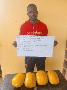 Also, one Aliyu Saidu, suspected to be a fake soldier was arrested with 2.3kg of Cannabis Sativa in a commercial bus from Lagos to Makurdi, on Monday 13th of Sept at Aliade checkpoint, Benue State.