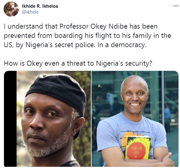I understand that Professor Okey Ndibe has been prevented from boarding his flight to his family in the US, by Nigeria’s secret police. In a democracy. How is Okey even a threat to Nigeria’s security?