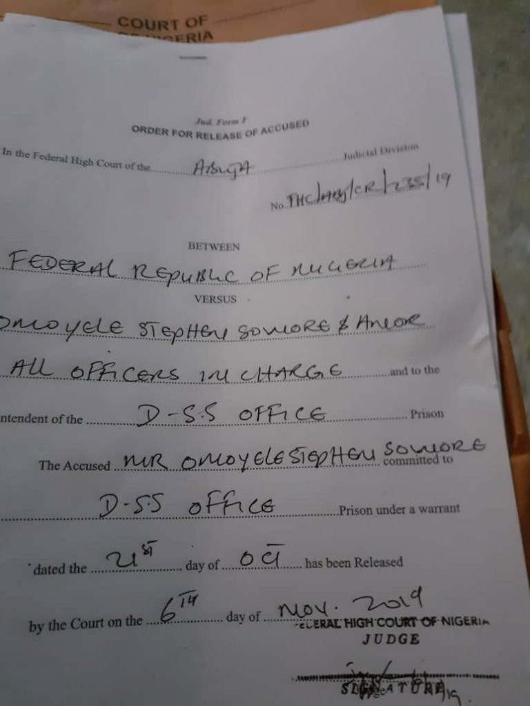 “Pursuant to the verification of the sureties of Omoyele Sowore and Olawale Bakare by the Federal High Court, the trial judge, the Honourable Justice Ifeoma Ojukwu made an order on November 6, 2019 for the release of the defendants from the custody of the DSS,” Falana said in a statement.
