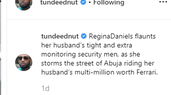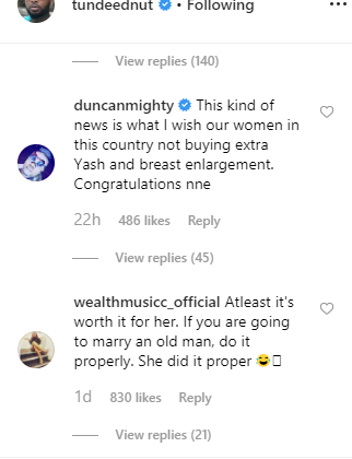 Duncan Mighty who took to Tunde Ednut’s comment section to congratulate Regina Daniels after he shared a post about the Ferrari, shade he was tired of reading news of women undergoing boobs and ass enlargement surgery.