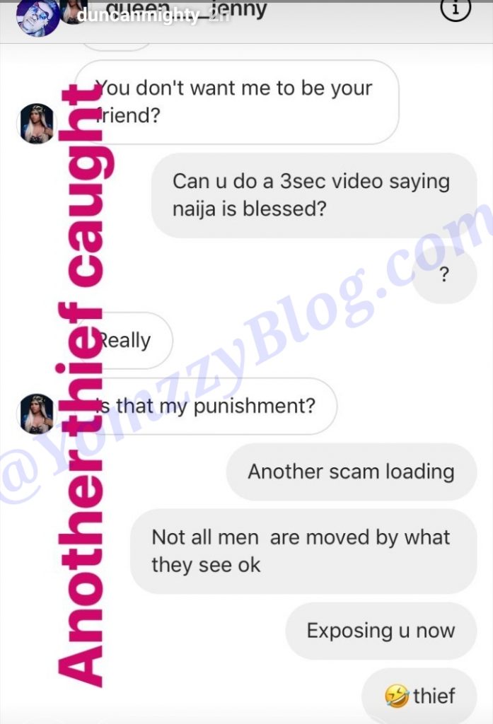 Nigerian singer, Duncan Mighty might have exposed a suspected fraudster posing as an endowed lady.