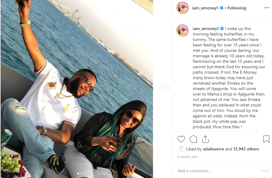 E-Money wrote “I woke up this morning feeling butterflies in my tummy. The same butterflies I have been feeling for over 15 years since I met you. And of course darling, our marriage is already 10 years old today. Reminiscing on the last 15 years and I cannot but thank God for ensuring our paths crossed. If not, the E-Money many know today may have just remained another Emeka on the streets of Ajegunle. You will come over to Mama’s shop in Ajegunle then, not ashamed of me. You saw Emeka then and you believed in what could come out of him. You stood by me against all odds.