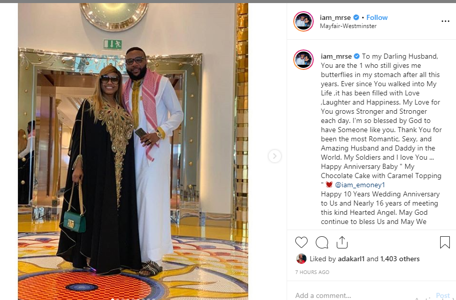 Popular Nigerian businessman, E-Money and his wife Juliet took to Instagram to celebrate each other on their 10th wedding anniversary.