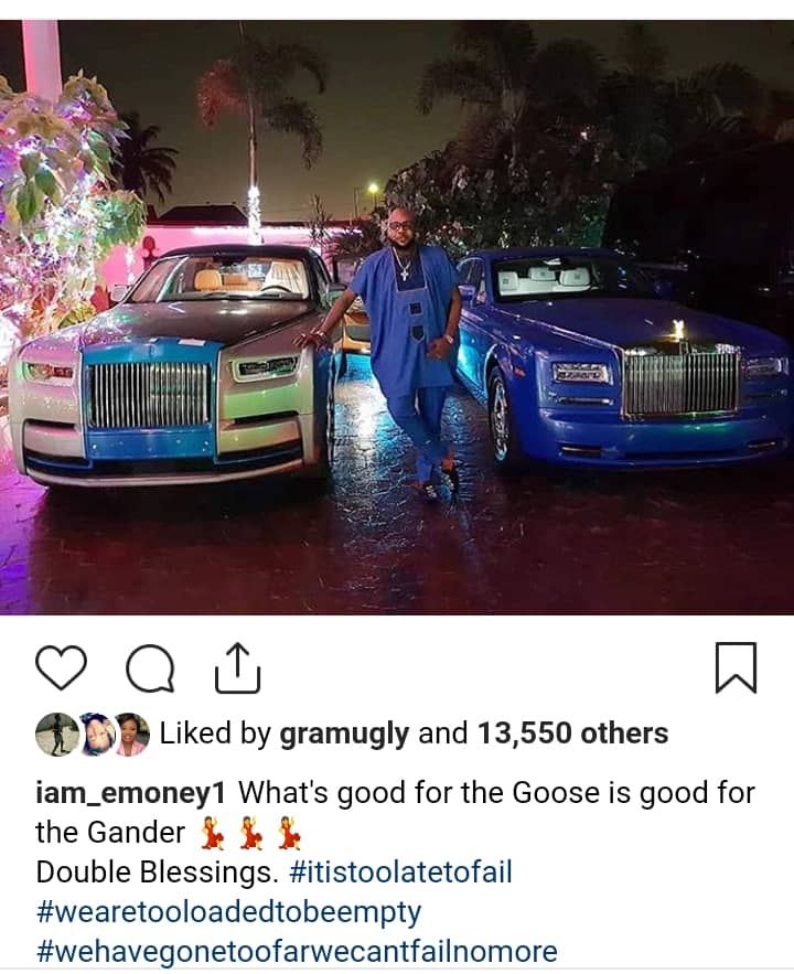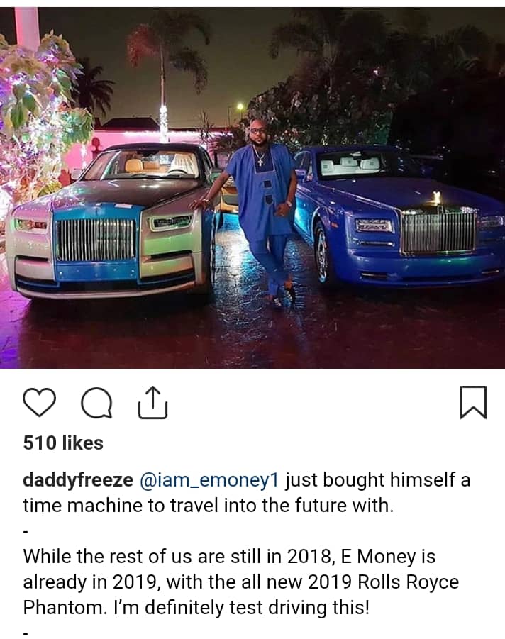 Just barely a week after buying Rolls-Royce Phantom for his pretty wife, Juliet Okonkwo, E-money has bought his own 2019 Rolls Royce Phantom.