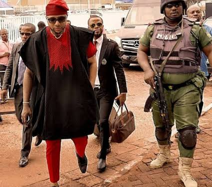 E-Money, it was learnt, arrived at the Police Headquarters Annex, Kam Salem, Obalende, Ikoyi, around 1pm in a wine-coloured suit.