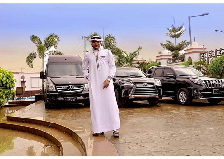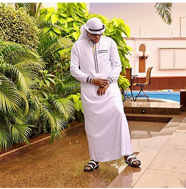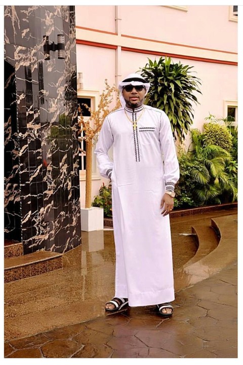 Five star music boss, E-MONEY took to his Instagram page to share this new photo of himself dressed in Saudi traditional wear in his five star mansion as he celebrates Sallah with Muslims.