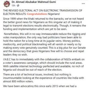 Gumi in a Facebook post he shared, averred that e-transmission of election result will stop money politics, mediocrity, and political blackmailing.