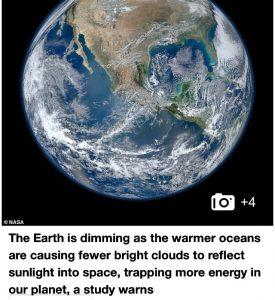 Earth is dimming as the warmer oceans are causing fewer bright clouds to reflect sunlight into space, trapping more energy in our planet, a new study has warned.