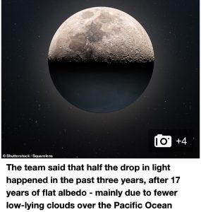 The team said that half the drop in light happened in the past three years, after 17 years of flat albedo, mainly due to fewer low-lying clouds over the Pacific Ocean.