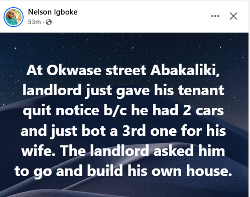 One Nelson Igboke claimed that a landlord in Abakaliki, Ebonyi State gave one of his tenants a quit notice because he has two cars and recently bought a third one for his wife.