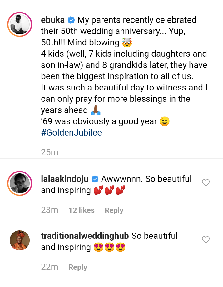 TV Host Ebuka shares adorable family at his parent’s 50th wedding anniversary. He wrote;
