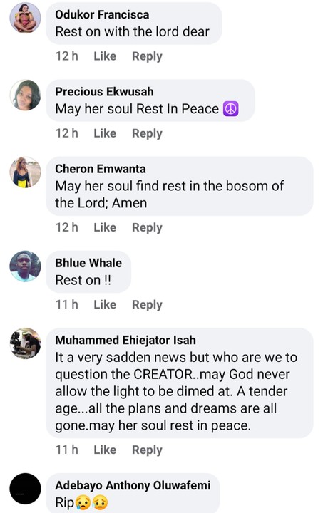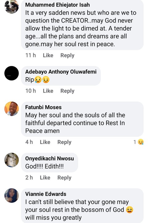 I am really saddened and filled with pain .. my heart bleeds when I got the new of your exit ..my first ever female bass drummer and my first love .. wish I could get the slightest chance to see you again or even pay you my last respects…. may your soul rest in peace Miss Edith Eddyth Obianuju Odidika”