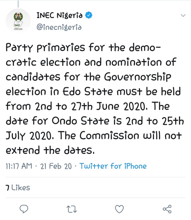 The Independent National Electoral Commission (INEC) has fixed date for party primaries and nomination of candidates for the Edo and Ondo governorship elections slated for September 19 and October 10 respectively.
