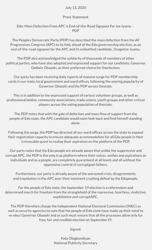 Edo: Mass Defection From APC is End-of-the-Road Signpost For Ize-Iyamu – PDP