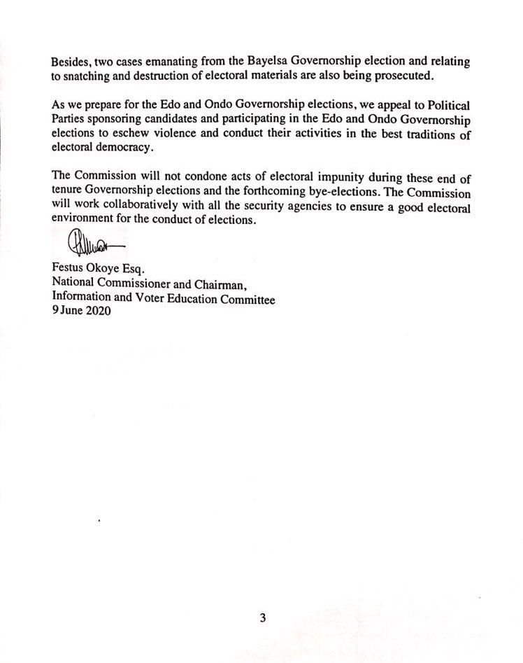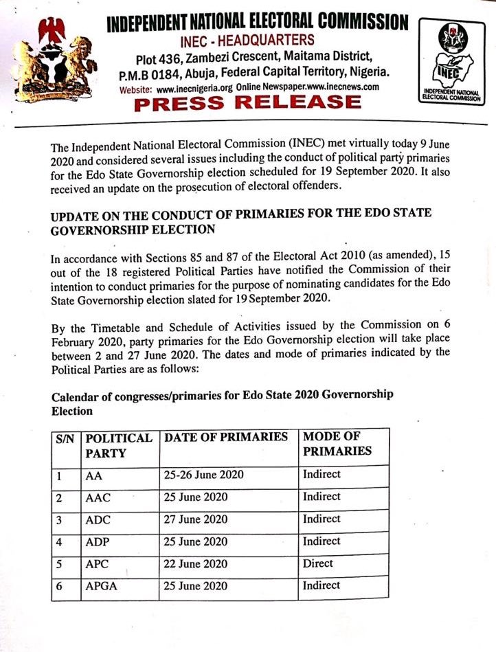 The commission which met virtually said it considered several issues including the conduct of political party primaries for the Edo State Govemorship election scheduled for 19 September 2020 as well as an update on the prosecution of electoral offenders.