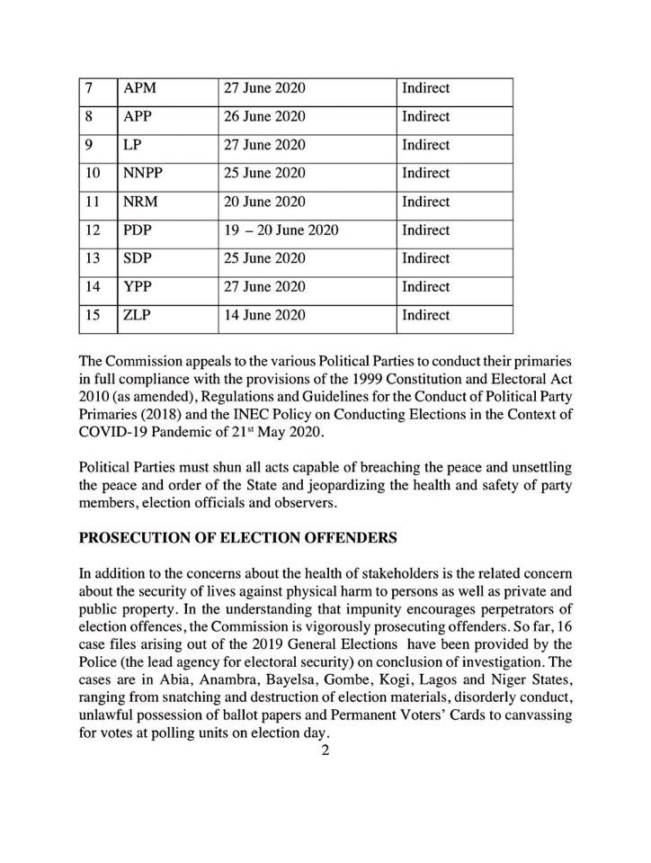 ” The Commission appeals to the various Political Parties to conduct their primaries in full compliance with the provisions of the I999 Constitution and Electoral Act 20l0 (as amended). Regulations and Guidelines for the Conduct of Political Party Primaries (2018) and the INEC Policy on Conducting Elections in the Context of COVlD-IQ Pandemic.