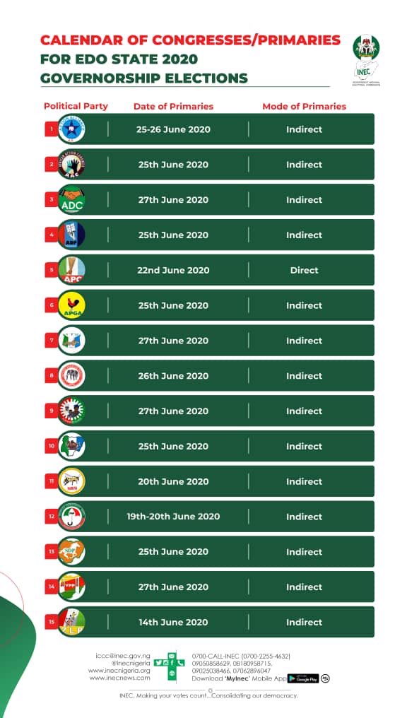 INEC said it has received notification from 15 out of the 18 registered Political Parties of their intention to conduct primaries “for the purpose of nominating candidates for the Ed( State Govemorship election slated for 19 September 2020”.