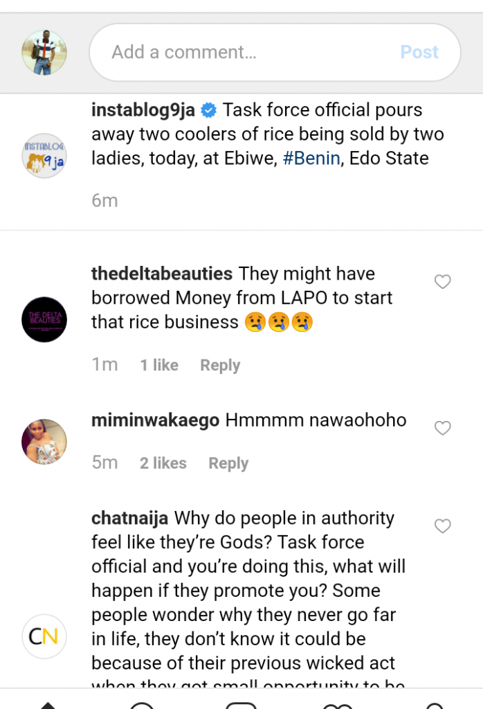 Task force official pours away two coolers of rice being sold by two ladies, today, at Ebiwe, Benin, Edo State.
