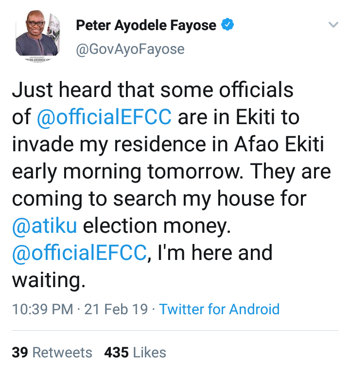 Just heard that some officials of EFCC are in Ekiti to invade my residence in Afao Ekiti early morning tomorrow. They are coming to search my house for atiku election money.