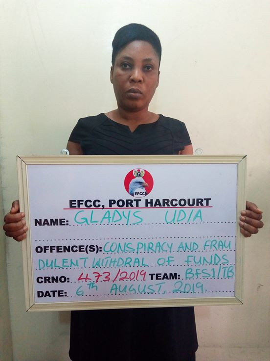 The Economic and Financial Crimes Commission, EFCC, Port Harcourt Zonal office on Wednesday, October 2, 2019 arraigned Gladys Udia before Justice M. L Abubakar of the Federal High Court sitting in Port Harcourt, Rivers State, on a seven-count charge bordering on conspiracy, stealing, forgery and alteration to the tune of N3,476,700.00(Three Million Four Hundred and Seventy Six Thousand, Seven Hundred Naira only) One of the counts read: “That you Gladys Udia and Dominic Okon a.k.a Paul (now at large) between the 24th and 31st of July, 2019, at Port Harcourt, Rivers State within the jurisdiction of this honourable court, whilst you were staff of Union Bank Plc stole the sum of (N3,434,000,00) Three Million, Four Hundred and Thirty Four Thousand Naira only, property of one Benjamin Akerele and thereby committed an offence punishable under Section 390 of the Criminal Code Act, Cap. C 38 of the Revised Edition (Laws of the Federation of Nigeria) 2007 read together with Section 1 (1) (b) of the Failed Banks (Recovery of Debts) and Financial Malpractices in Banks Act, Cap B3 of the Revised Edition (Laws of the Federation of Nigeria)2007” Udia’s trouble started when a petitioner, Benjamin Akerele, a customer of Union Bank, Port Harcourt, sought the intervention of the EFCC over the theft of his money in the bank. The petitioner alleged that sometimes between July 24 and August 6, 2019, a total sum of N3,476,700.00(Three Million, Four Hundred and Seventy Six Thousand, Seven Hundred Naira only) was fraudulently withdrawn from his account domiciled in a Union Bank’s Sokoto branch. Investigation carried out by the bank’s internal affairs unit revealed that the principal suspect, Gladys Udia, a staff of the Ikwerre Road branch in Port Harcourt was captured by the bank’s CCTV Camera taking photographs of the customer’s BVN printout page with her mobile phone and sent same to her accomplices, who subsequently carried out a limit enhancement on the customer’s account at the Bori branch, thereby granting them access to the account. Investigations also revealed that between July 25, 28 and August 6, 2019, a total sum of N3, 476, 700.00 Three Million Four Hundred and Seventy Six Thousand, Seven Hundred Naira was fraudulently transferred by Udia from the account of Akerele to several accounts of her accomplices. The defendant pleaded not guilty to all the seven-count charges when read to her. In view of her plea, Prosecuting Counsel, M. T. Iko prayed the court to fix a date for commencement of trial. However, counsel to the defendant, U. A Ekwere immediately informed the court of a pending application for the bail of the defendant. He also prayed the court to grant the defendant bail in liberal terms which was not opposed by the prosecution counsel. Justice Abubakar granted the defendant bail in the sum of N1,000.000.00( One Million Naira only) and one surety in like sum. The surety must be a civil servant on grade level 10 and resident in Port Harcourt. The surety must be verified by the prosecution. The Judge also ordered that the defendant be remanded in prison custody pending the fulfillment of her bail conditions, while the matter was adjourned to October 10, 2019 for continuation of trial.