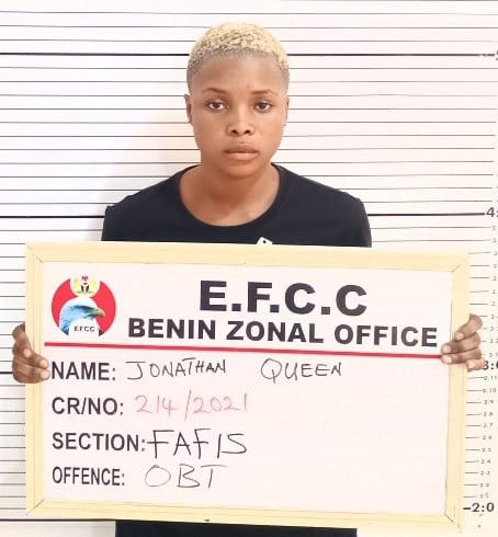 Operatives of the Benin Zonal Office of the Economic and Financial Crimes Commission, EFCC, on Friday March 26, 2021 arrested one Queen Jonathan, for suspected internet fraud in Oghara, Delta State, IgbereTV reports.