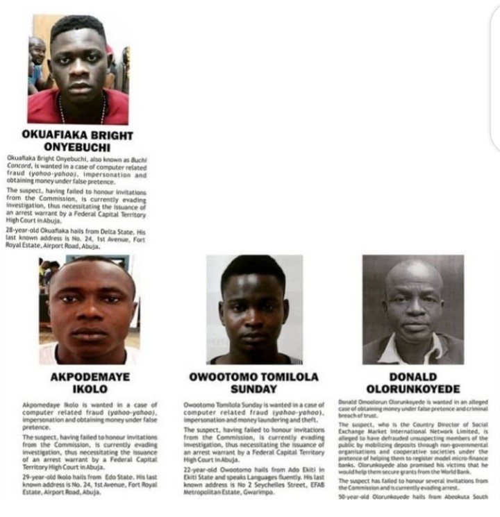 THE GENERAL PUBLIC IS HEREBY NOTIFIED THAT THESE PEOPLE ARE WANTED BY THE EFCC FOR OFFENCES BORDERING OF FRAUD.