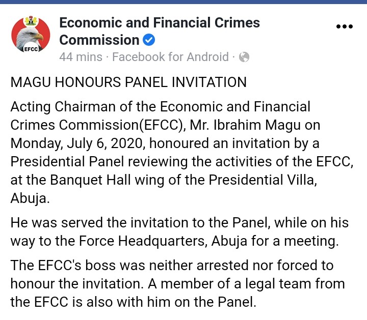 Acting Chairman of the Economic and Financial Crimes Commission(EFCC), Mr. Ibrahim Magu on Monday, July 6, 2020, honoured an invitation by a Presidential Panel reviewing the activities of the EFCC, at the Banquet Hall wing of the Presidential Villa, Abuja.