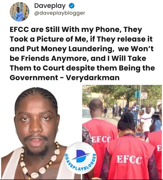 Tribune Online reports that VeryDarkMan also disclosed that his phone is currently with the EFCC, expressing concerns that the agency might tamper with his personal documents.