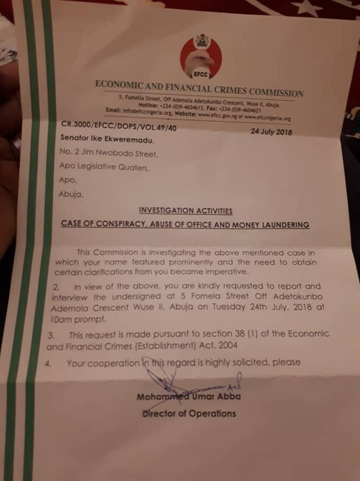 The Economic and Financial Crimes Commission (EFCC) have delivered a letter dated today inviting the Deputy Senate President Ike Ekweremadu to appear at their office by 10am. The letter was delivered after officials of the Department of State Security Services, (DSS), the Police as well as the Economic Financial Crimes Commission (EFCC) on Tuesday morning laid siege to his APO residence in Abuja.