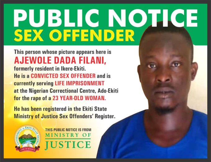 His name and photograph was posted in public places as a way of deterring people from engaging in rape. Filani, a young man formerly living in Ikere Ekiti, is at present serving life imprisonment at the Nigerian Correctional Centre, Ado Ekiti, for raping a 23-year-old lady.