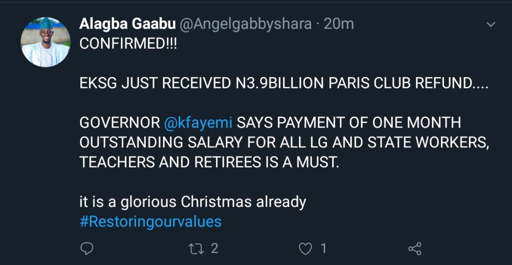 GOVERNOR @kfayemi SAYS PAYMENT OF ONE MONTH OUTSTANDING SALARY FOR ALL LG AND STATE WORKERS, TEACHERS AND RETIREES IS A MUST.